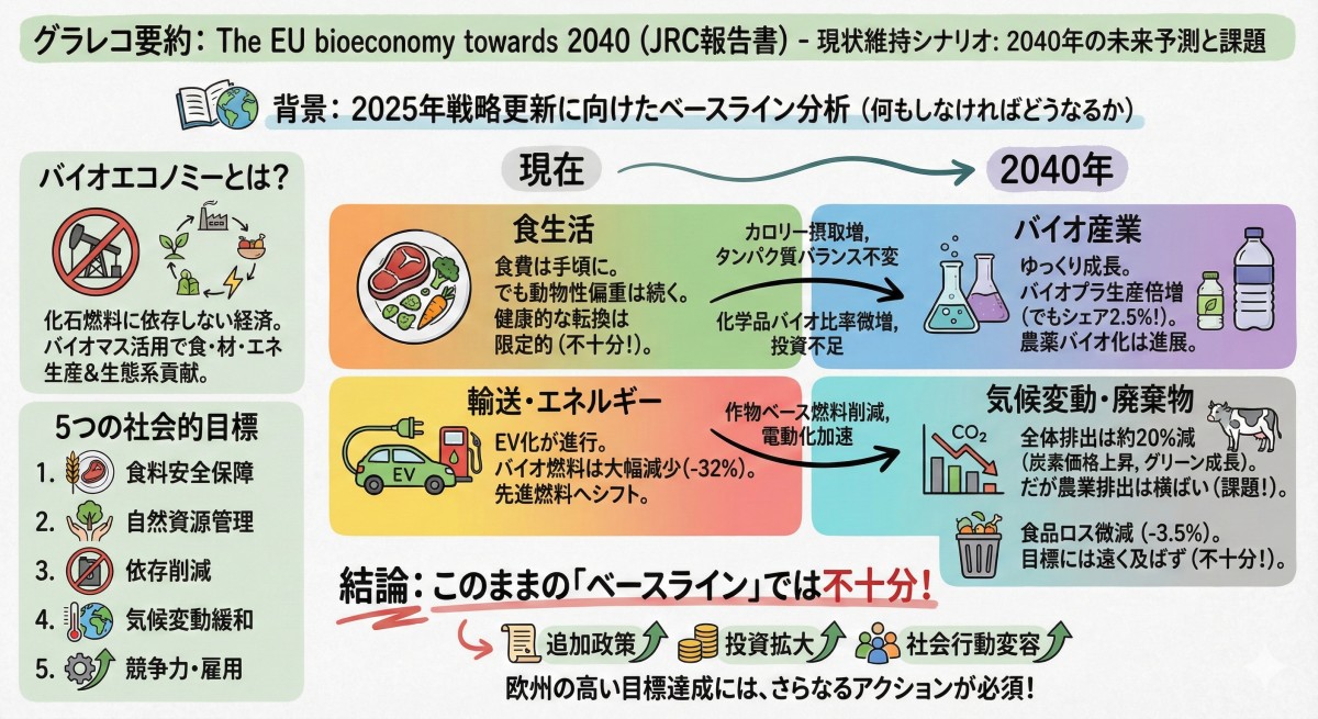 さて、そんな僕の復活を待っていたかのように、欧州連合(EU)の研究機関である共同研究センター(JRC)が、報告書「The EU bioeconomy towards 2040」を発表しました。このレポートは、EUのバイオエコノミーが2040年に向けてどのように発展していくかを、経済モデルを用いて分析したものです。