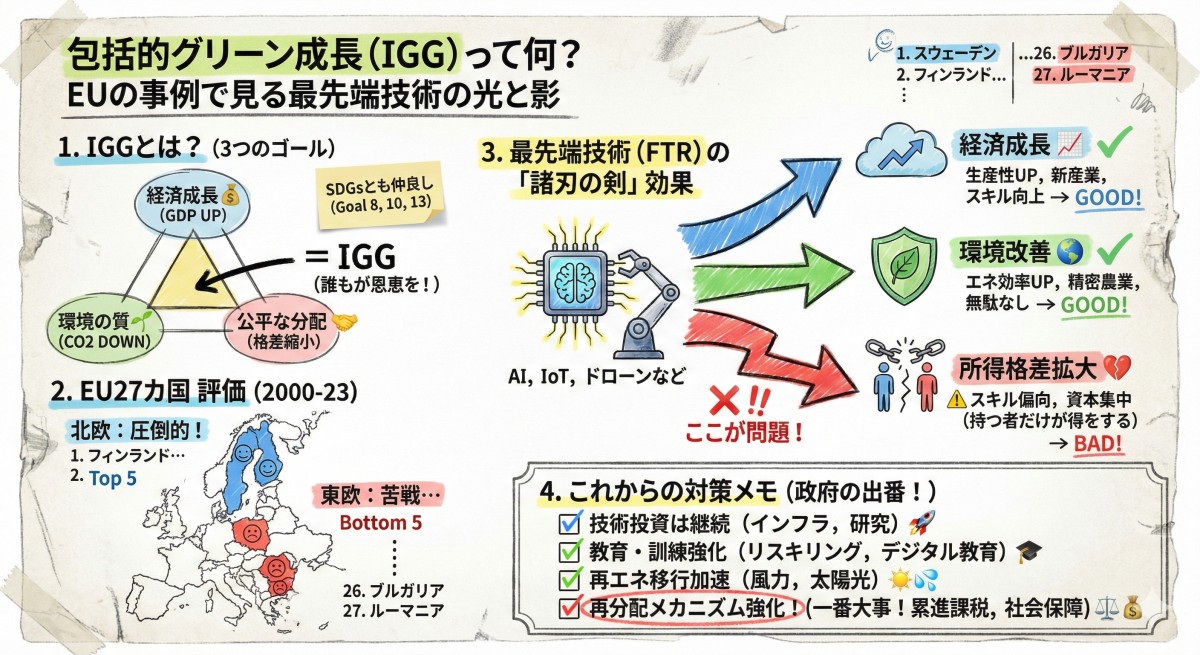 つまり、従来の「グリーン成長」論は、経済と環境の両立に焦点を当てていましたが、IGGはそこに「誰もが恩恵を受けられるか」という社会的公正の視点を加えています。